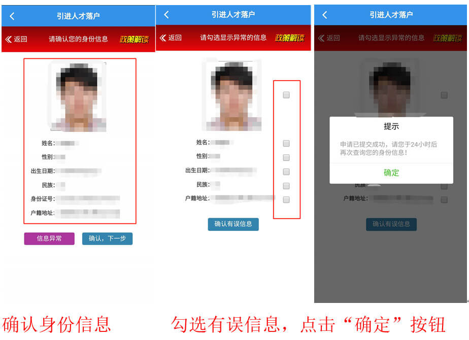 如个人信息有误,选择“信息异常”按钮,并勾选显示异常的信息,点击“确认有误信息”按钮(出现申请提交成功提示后点击“确定”按钮,24小时后可重新申请)。