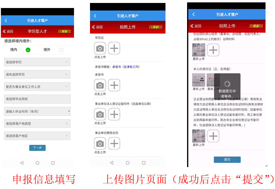 4. 填写申报信息,并上传申请材料图片(全部上传成功后点击提交按钮)。