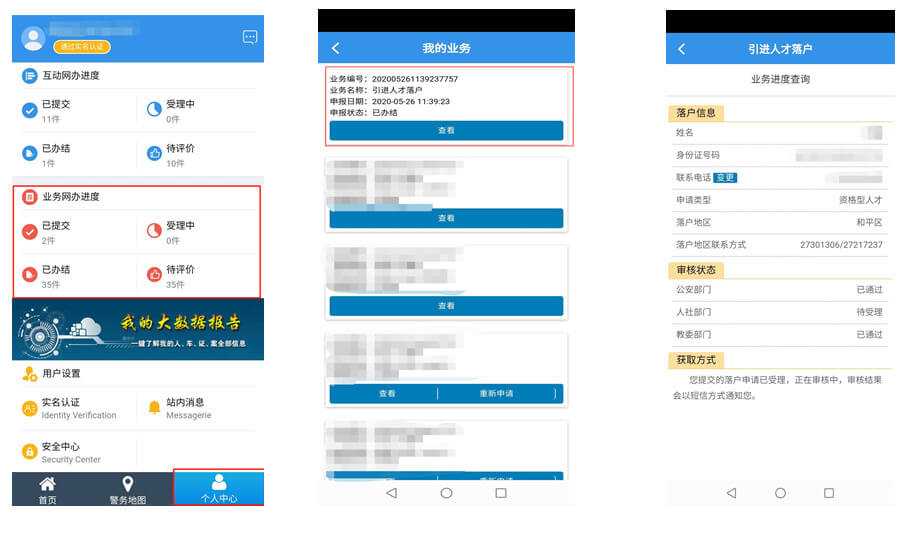 提交成功后,在个人中心的“业务网办进度中点击“查看”按钮,即可查询到申请的落户信息及办理状态。