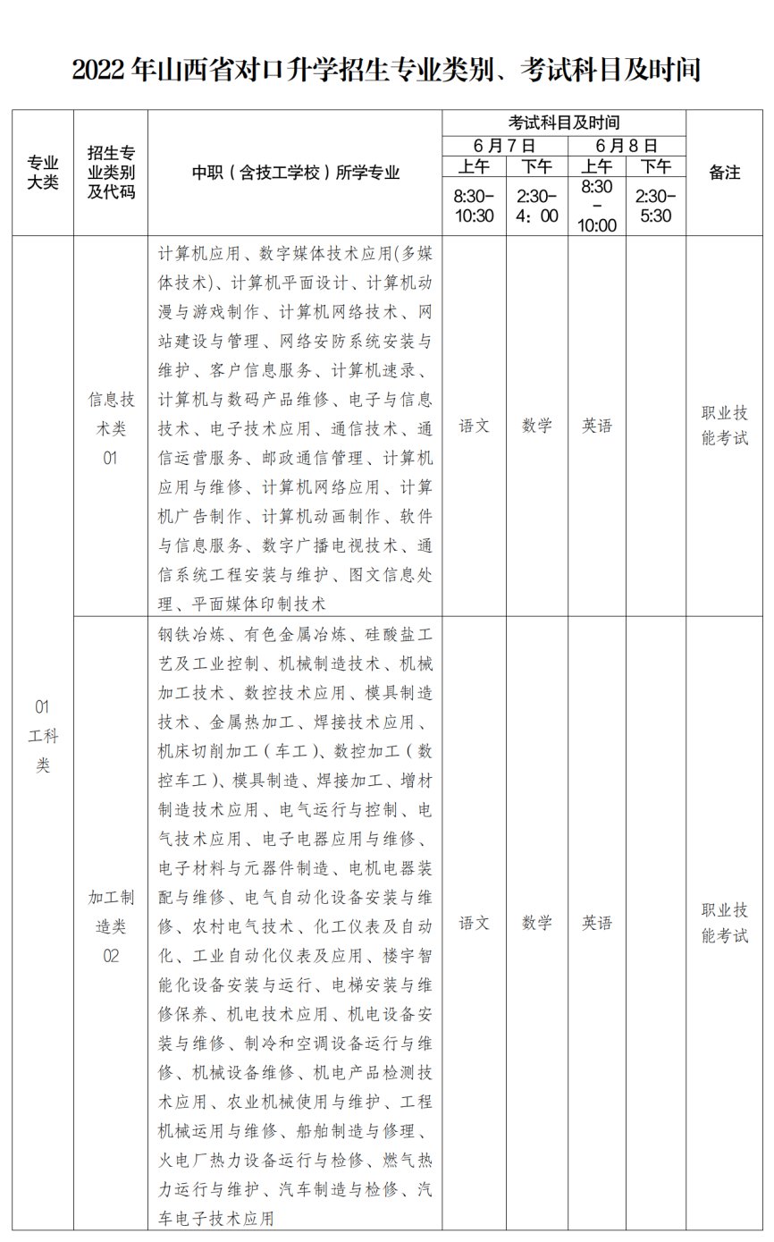 根据《山西省教育厅关于做好2022年中等职业学校毕业生对口升学工作的通知》(晋教职成〔2021〕15号)和《山西省招行考试管理中心关于做好2022年中等职业学校毕业生对口升学招生考试工作的通知》文件精神,2022年部分高等院校继续从中等职业学校(含普通中专学校、职业中专学校、职业高中学校、成人中专学校、技工学校,下同)毕业生中对口招生,现将招生考试工作的有关事项公告如下。