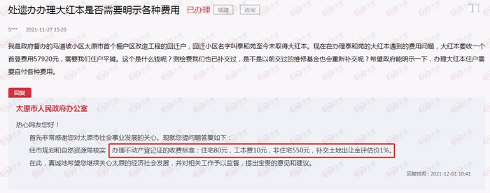 官方回复:经市规划和自然资源局核实:办理不动产登记证的收费标准:住宅80元,工本费10元,非住宅550元,补交土地出让金评估价1%。