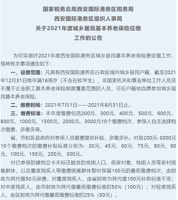 为切实做好2021年度西安国际港务区城乡居民基本养老保险费征缴工作,现将有关事项通告如下: