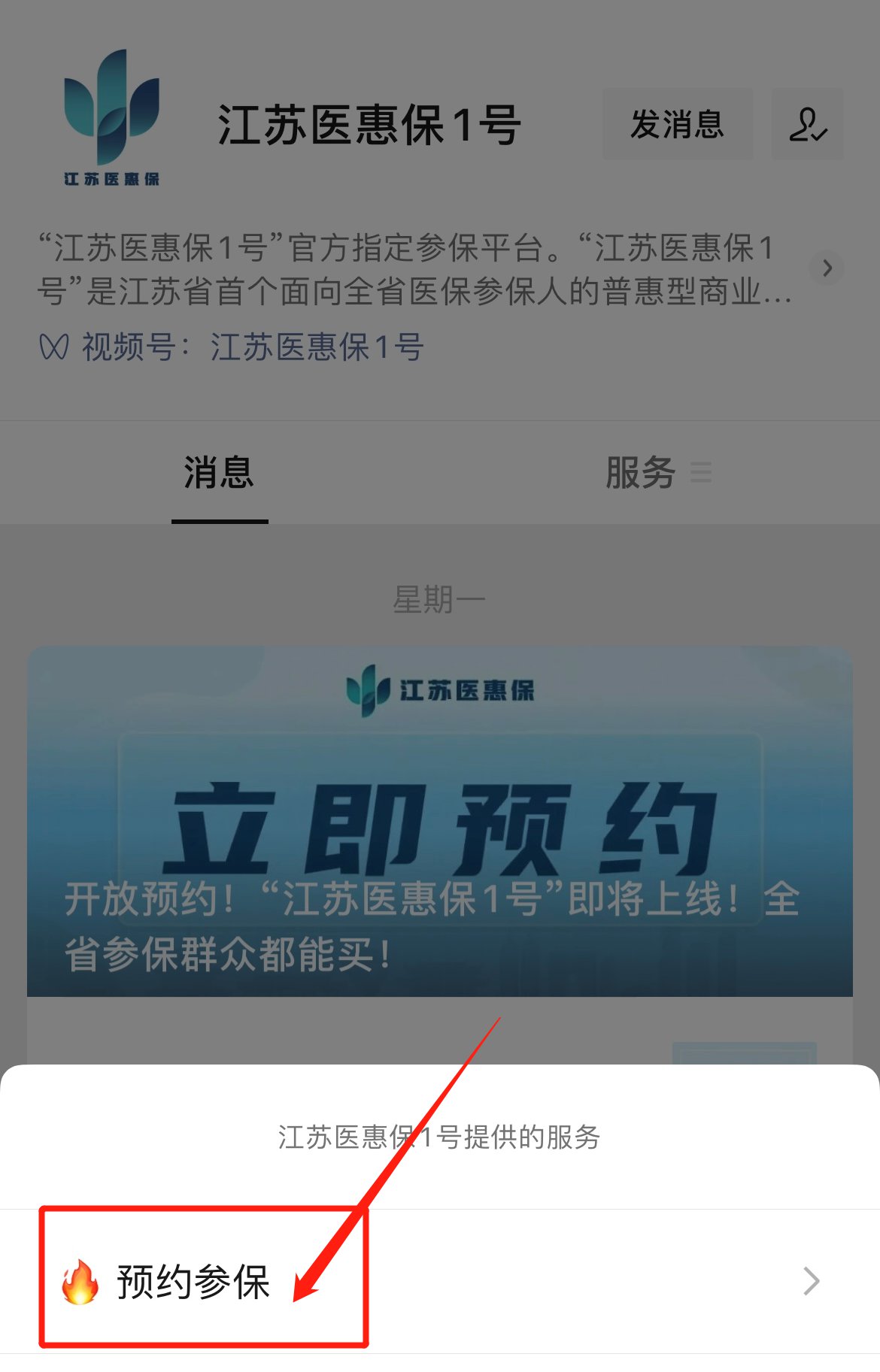 进入“江苏医惠保1号”微信公众号—“服务”—立即预约。