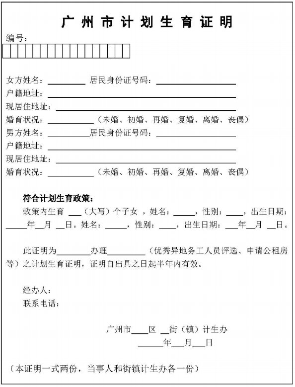 计划生育证明样本(以相关部门实际出具的表单为准):