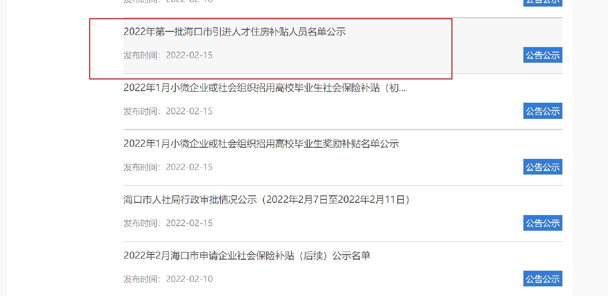 海口引进人才住房补贴公示
