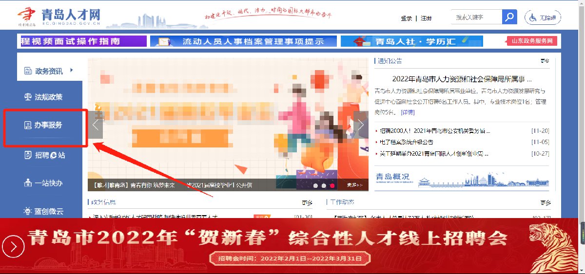 1、申请人登录青岛人才网官网,选择”办事服务“模块。
