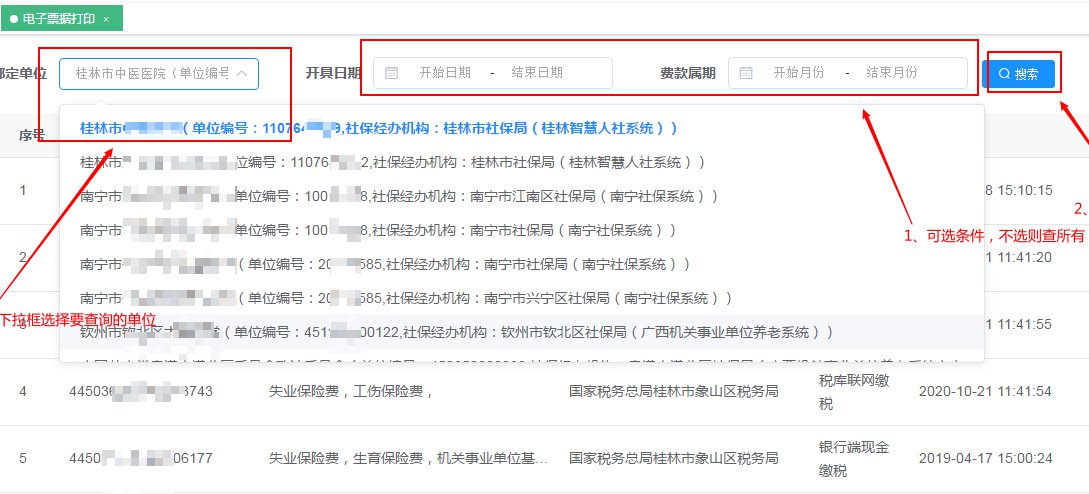 登录广西税务用人单位客户端(社保费专用)进入后台(PS:若已登录请忽略) >> 点击左侧导航菜单“票据打印 > 电子票据打印”>> 可以根据绑定单位、开具日期、费款属期等条件进行搜索 >> 在搜索结果中点击最右侧操作下方的【打印】按钮。