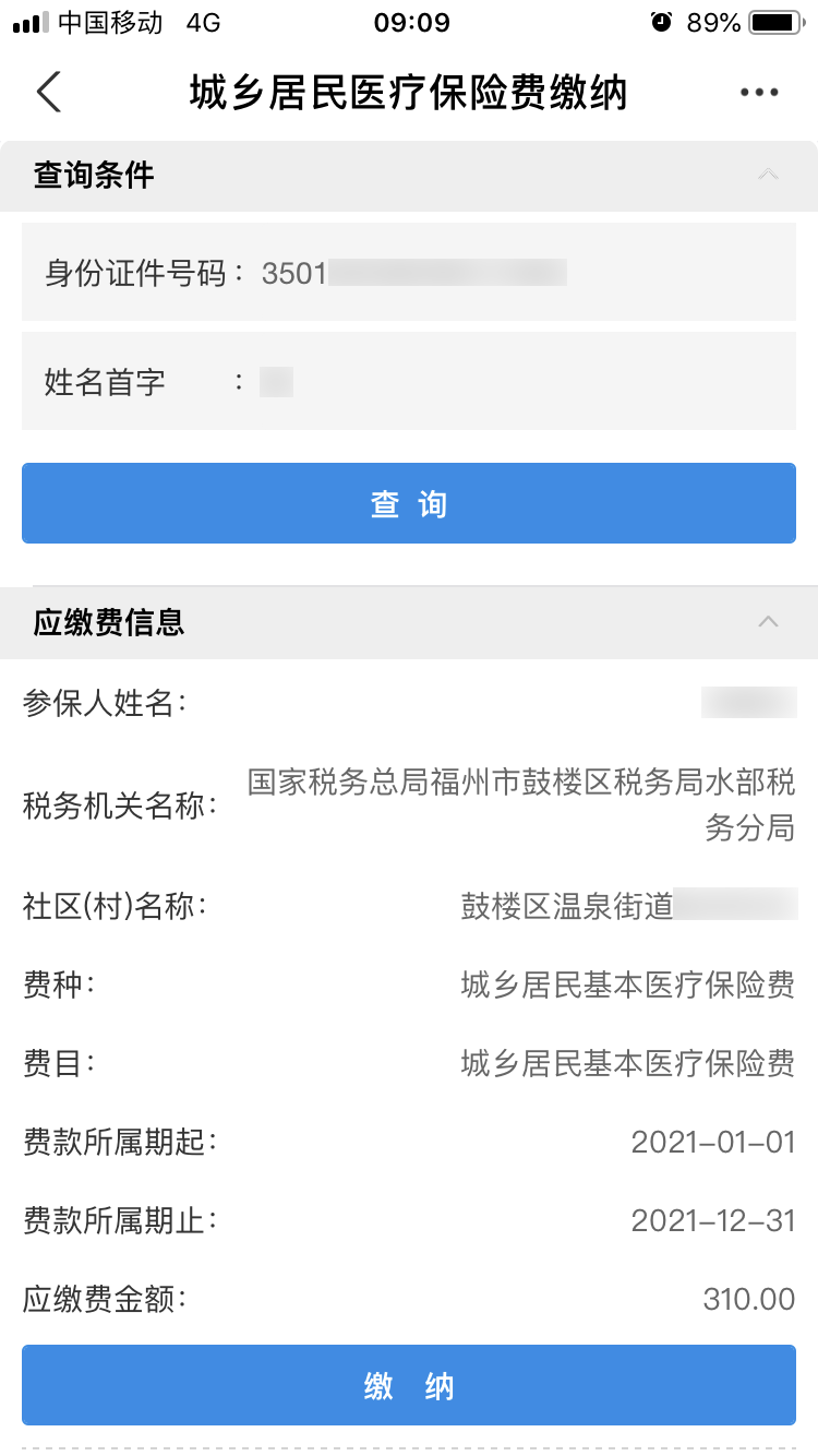 根据页面提示输入身份证号码及姓名首字,点击查询,确认需缴费的信息后,提交缴费。
