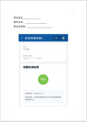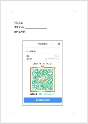 2. 微信下载登录“河北健康码”,查询本人核酸检测信息并截图,A4纸打印后本人签名,标注准考证号、身份证号码。