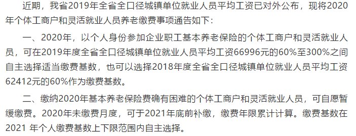 对于缴纳2020年基本养老保险费确有困难的个体工商户和灵活就业人员,可自愿暂缓缴费。2020年未缴费月度,可于2021年底前补缴,缴费年限累计计算。缴费基数在 2021 年个人缴费基数上下限范围内自主选择