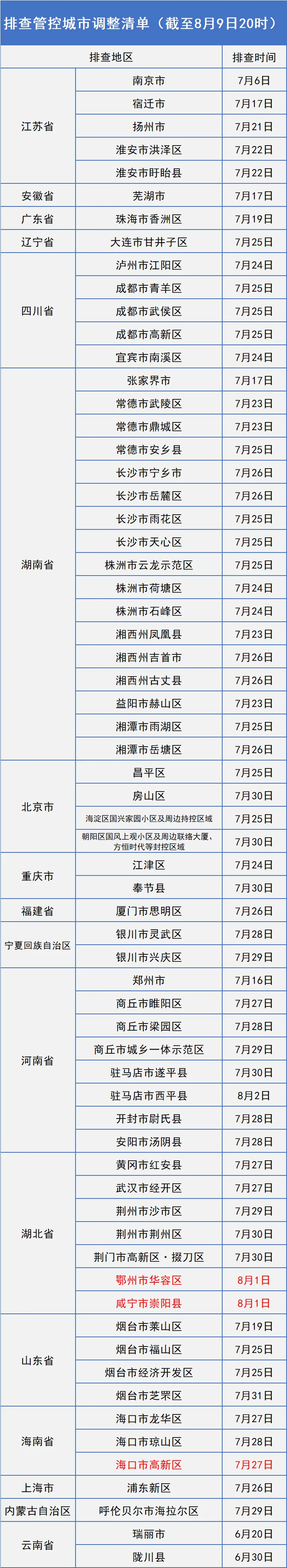 以下表格中的返(来)长人员立即主动向所在社区(村屯)报告,配合社区(村屯)落实相关防控措施。 附:排查管控城市调整清单(截至8月9日20时)