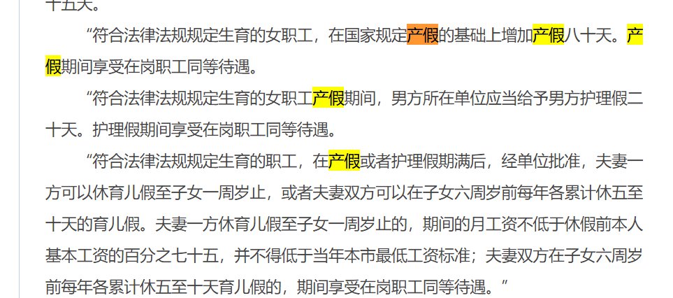 答:女职工生育的享受98天产假,其中产前可以休假15天;难产增加产假15天;生育多胞胎的,每多生育1个婴儿,增加产假15天。符合法律法规规定生育的女职工,在国家规定产假的基础上增加产假80天。产假期间享受在岗职工同等待遇。
