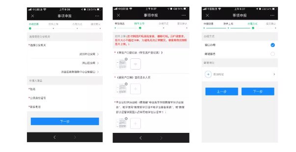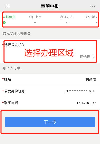 第四步,选择办理的区域填写个人信息,并上传资料,选择办理方式(窗口办理或邮递服务)即可确认提交;