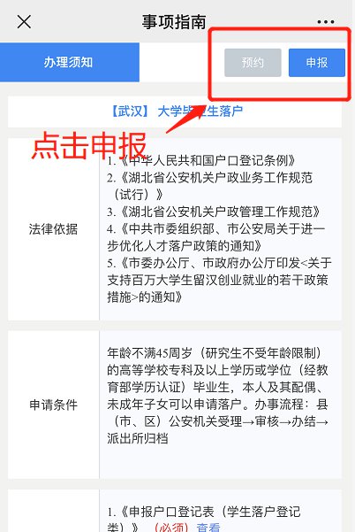 第三步,点击“大学毕业生落户”,查看办理条件以及申请材料后,点击右上角的“申报”,即可开始申报;