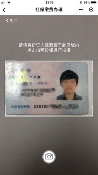 在信息填写页面,手动填写姓名、身份证号;也可直接点击照相机按钮,用手机摄像头自动识别身份证个人信息: