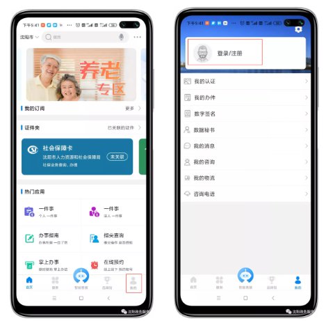 1)打开“沈阳政务服务”APP,找到“我的”—点击登录/注册;