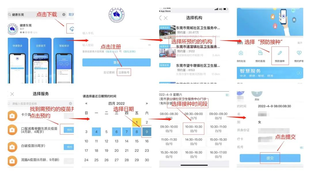 二、下载健康东莞APP——注册——选择预防接种——选择机构——选择疫苗——选择预约日期——选择预约时间段,提交后即可预约成功;