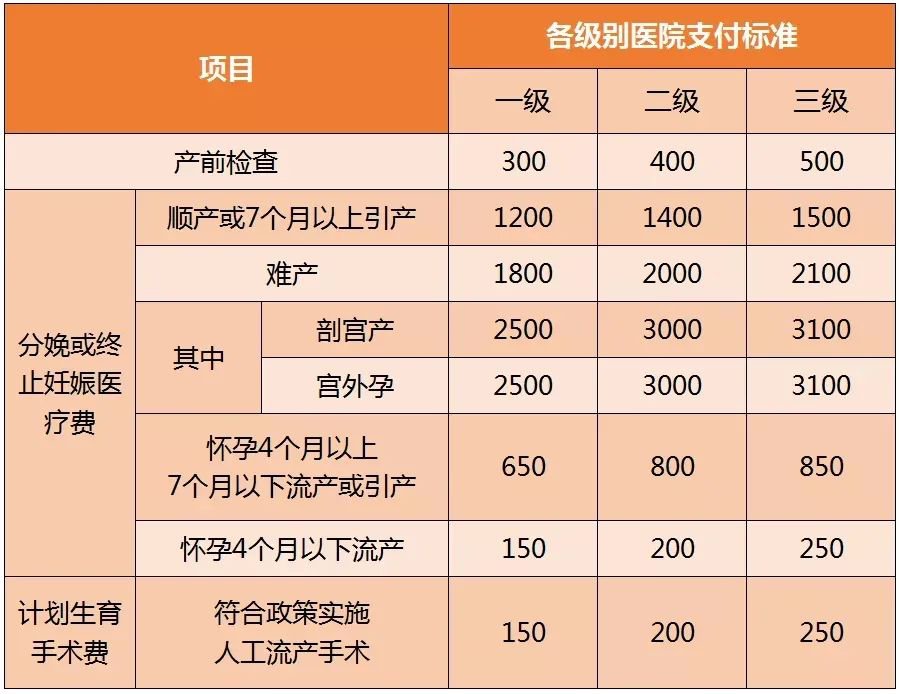重庆市职工生育保险医疗费用支付项目有产前检查、分娩或终止妊娠医疗费、计划生育手术费三大类,其标准见下图: