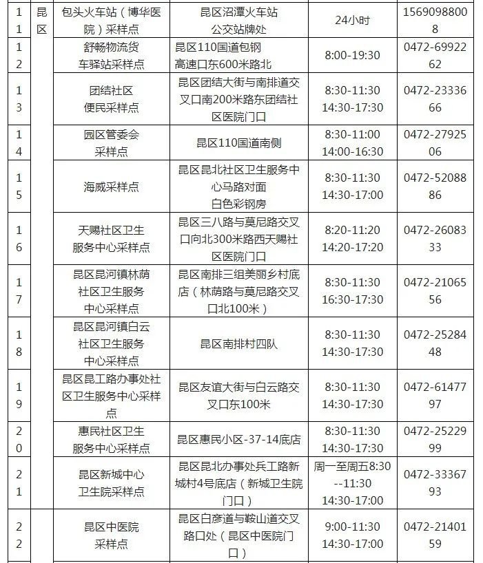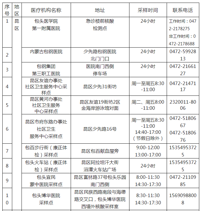 为切实做好常态化疫情防控工作,为群众提供安全、高效、便捷的核酸检测服务,按照包头市新型冠状病毒感染肺炎防控工作指挥部医疗防控组《关于合理增设核酸采样点的通知》(包防指医控发〔2022〕58号)要求,遵循安全、科学、便民的原则,依托基层医疗卫生服务机构,在城市社区“15分钟健康服务圈”范围内、科学合理增设核酸采样点,以便就近满足本地区“应检尽检”和“愿检尽检”人群核酸检测需求。具体安排见附表。