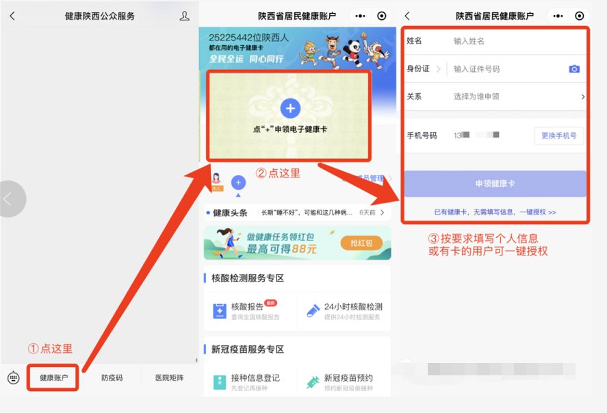 点击底部菜单栏“健康账户”→“点+申领电子健康卡”→按要求填写个人信息/有卡用户可一键授权→成功申领电子健康卡