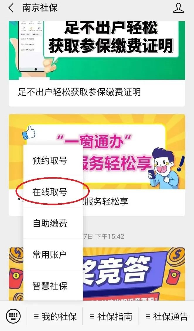 在“南京社保”微信公众号“我的社保”服务栏中点击“在线取号”,依次选择“服务大厅”、“办理类别”后,点击“取号”按钮即可完成线上取号。