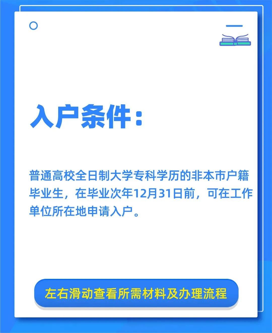 普通高校全日制大学专科学历的非本市户籍毕业生,在毕业次年12月31日前,可在工作单位所在地申请入户。