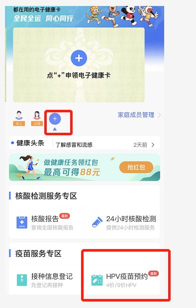 领卡流程:个人申领健康卡后,点击加号,或者向右滑动,替他人申领健康卡,即可替他人预约hpv疫苗