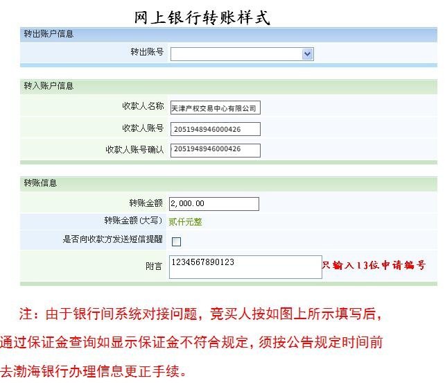 二、通过网上银行转账的,在缴款时须在网上银行支付界面的备注/用途/银行附言栏中准确填写办理增量指标竞价申请登记时所取得的申请编码(只需填写数字,不需填写任何文字)。若因竞买人未按要求填写相关信息而导致其无法参与竞价的,由此产生的一切后果和责任由竞买人自行承担。
