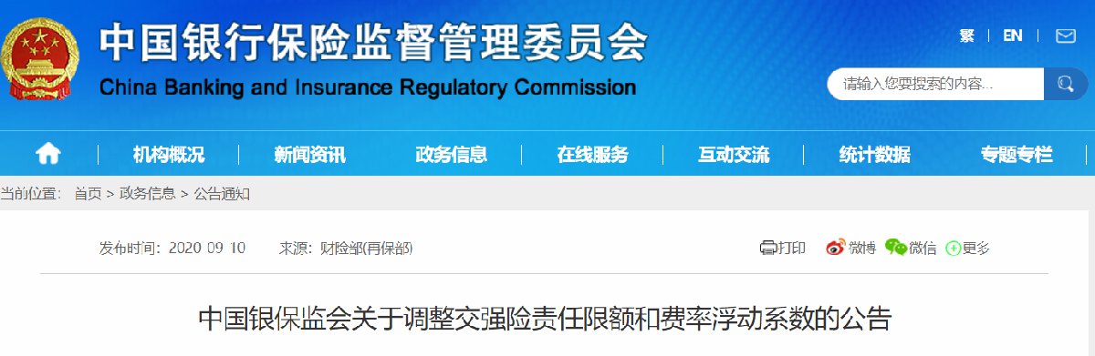 中国银保监会关于调整交强险责任限额和费率浮动系数公告内容