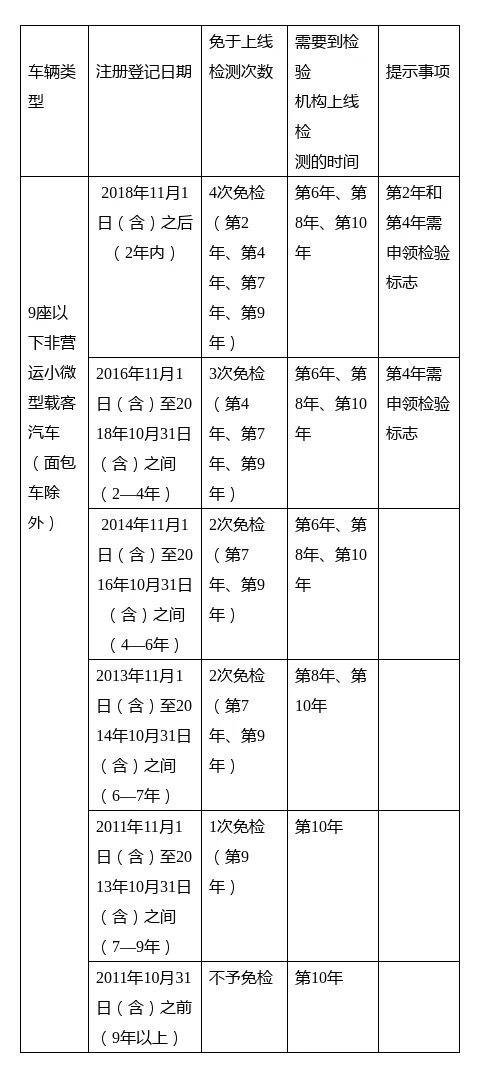 自2020年11月20日起,注册登记6年以内的9座以下非营运小微型客车(面包车除外)免检。