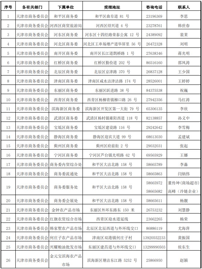 3.东丽区金钟农产品批发市场、西青区红旗农贸综合批发市场、津南区 何庄子农产品批发市场、北辰区韩家墅海吉星农产品批发市场、东丽区兴耀粮 油批发市场、静海区海吉星农产品市场、滨海新区金元宝滨海农产品交易市 场,分别负责对本市场商户进行认定。