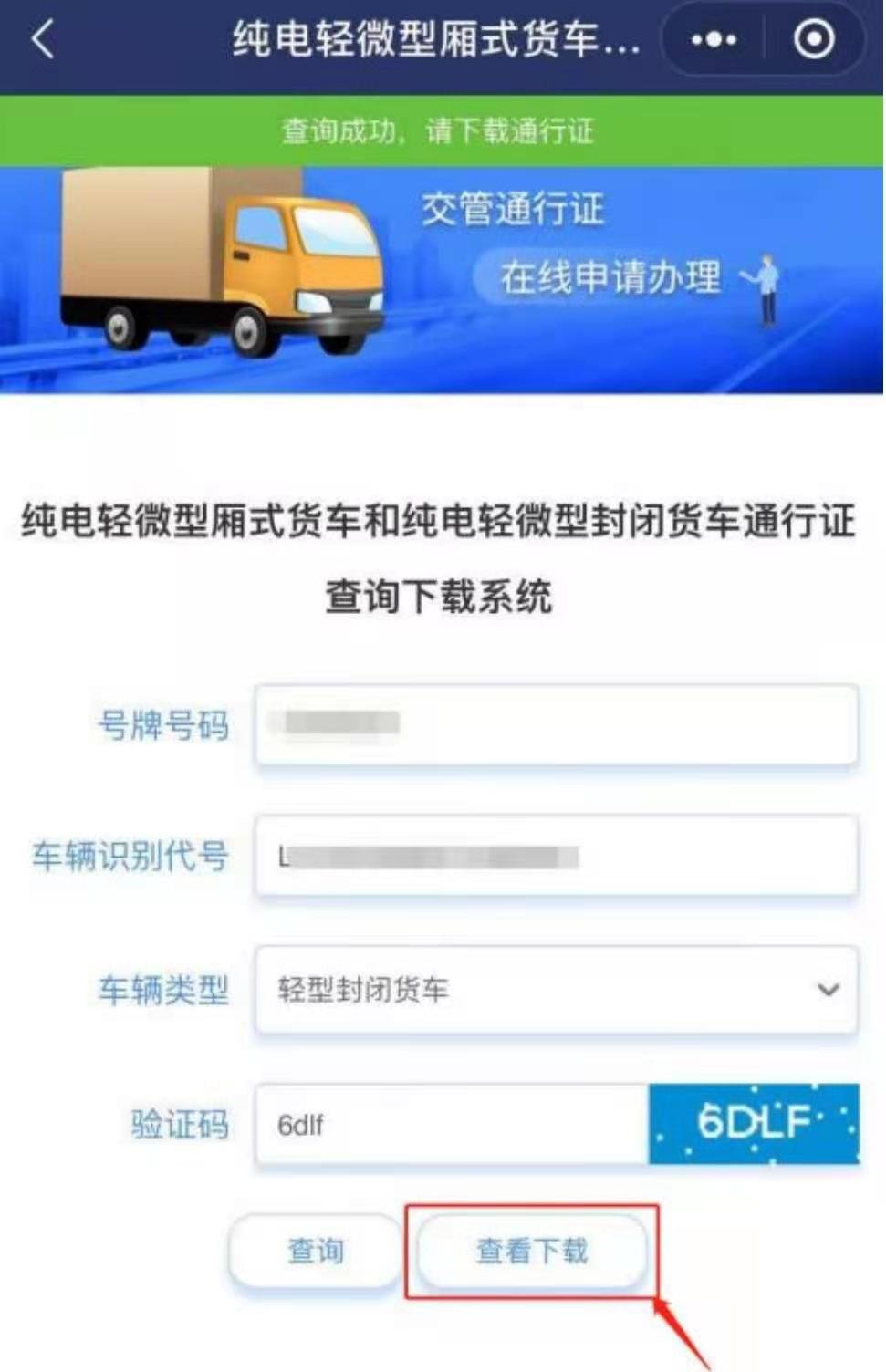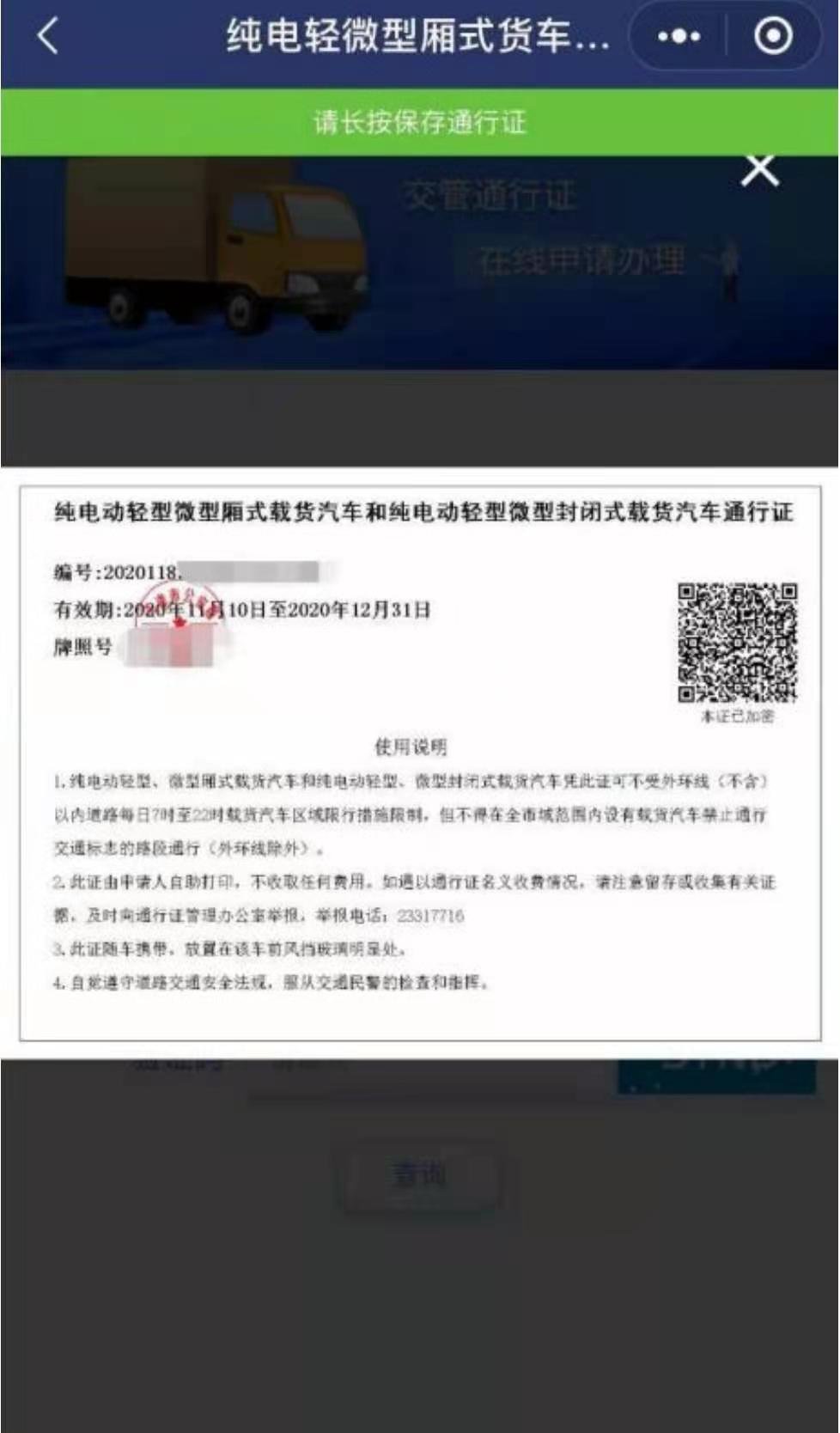 三、在图 3 的查询页面中输入号牌号码(输入时无需输入省份代号)、车辆识别代号、选择车辆类型、并输入验证码,然后点击“查询”按钮进行查询,查询后的结果显示如图 4 所示。点击图 4 下方的“查看下载”按钮弹出如图 5 所示的页面。长按图 5 中的通行证图片可以将电子版的通行证保存到手机相册中。