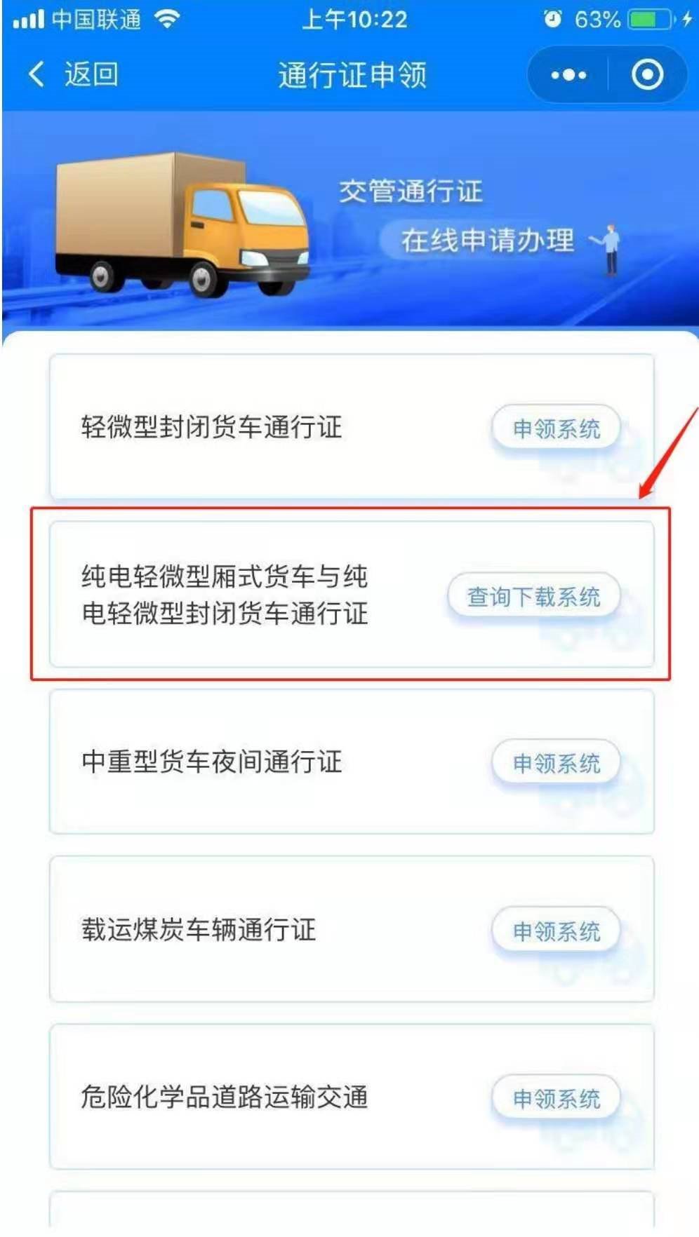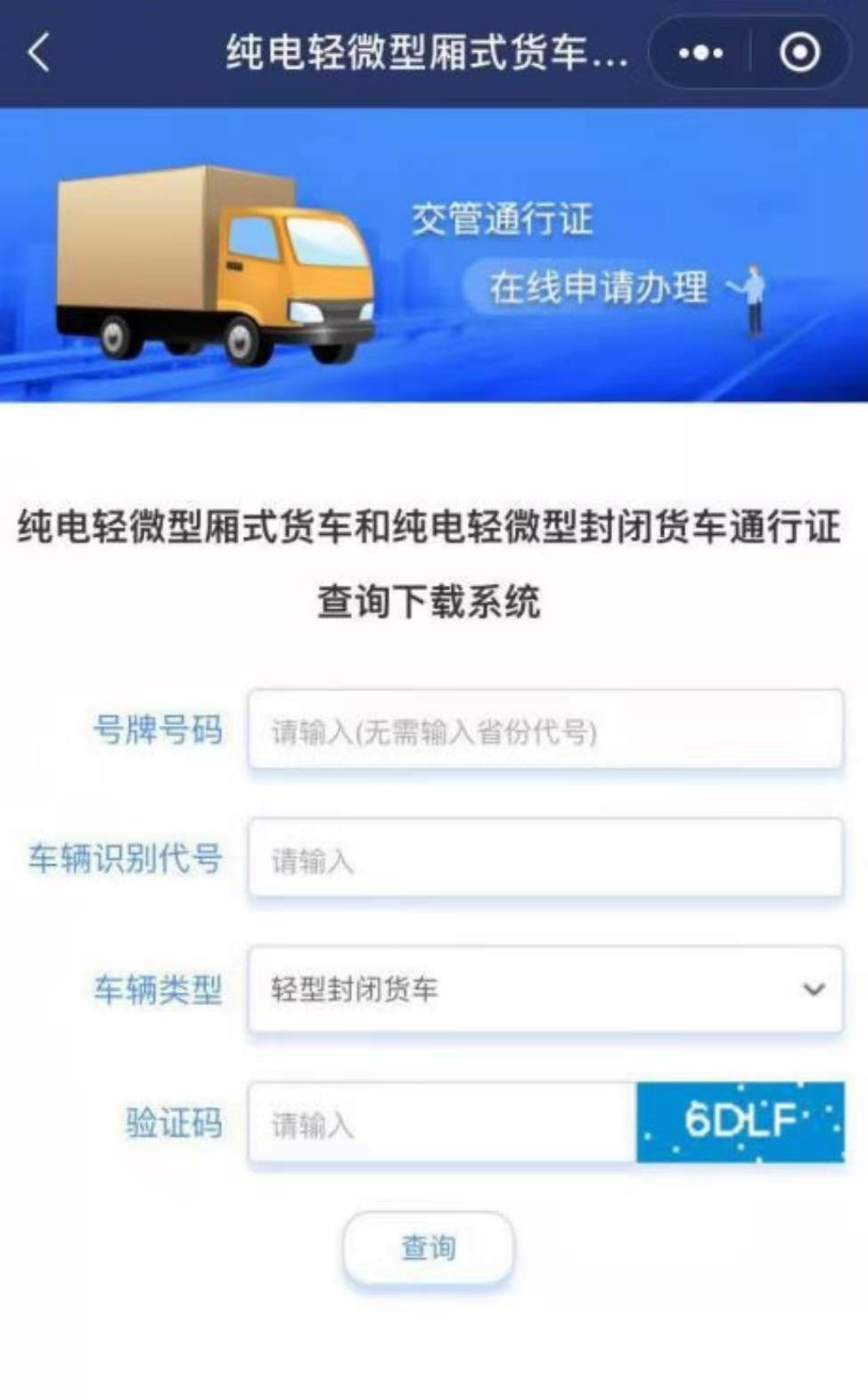 二、在图 2 中点击“纯电轻微型厢式货车与纯电轻微型封闭货车通行证”的“查询下载系统”按钮,点击后进入到如图 3 所示的“纯电轻微型厢式货车和纯电轻微型封闭货车通行证查询下载系统”。