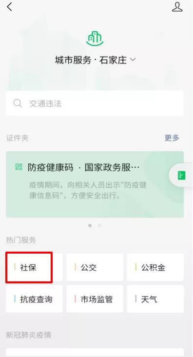 2.在上方选择对应“城市”→选择热门服务“社保”(以石家庄为例);