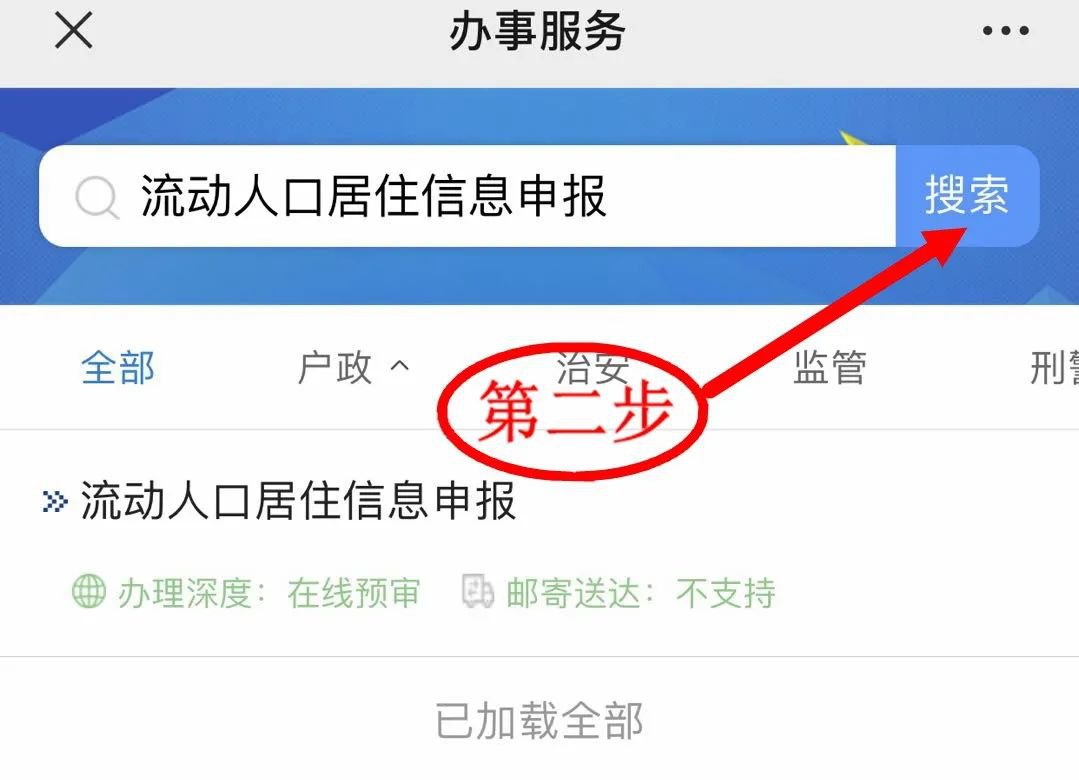点击【我要办事】在搜索条中输入【流动人口居住信息申报】,找到申报入口后完成申报,点击提交即可。