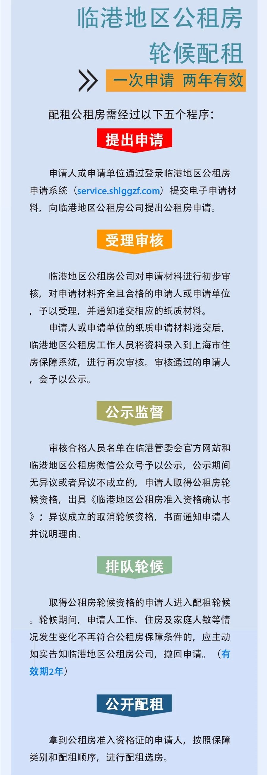 注:轮候配租”指提出申请到正式选房入住之间排队等候的过程,在申请人通过临港地区公租房网上申请平台提出申请后,临港地区公租房工作人员会进行初审,初审通过后会通知申请人递交纸质材料进行复审,并将资料录入到上海市住房保障系统进行审核,审核通过后将在中国(上海)自由贸易试验区临港新片区管理委员会官方网站予以公示,公示期间无异议,申请人便可取得轮候配租资格。到了这一步,您便可以等待工作人员电话通知您进行选房了。