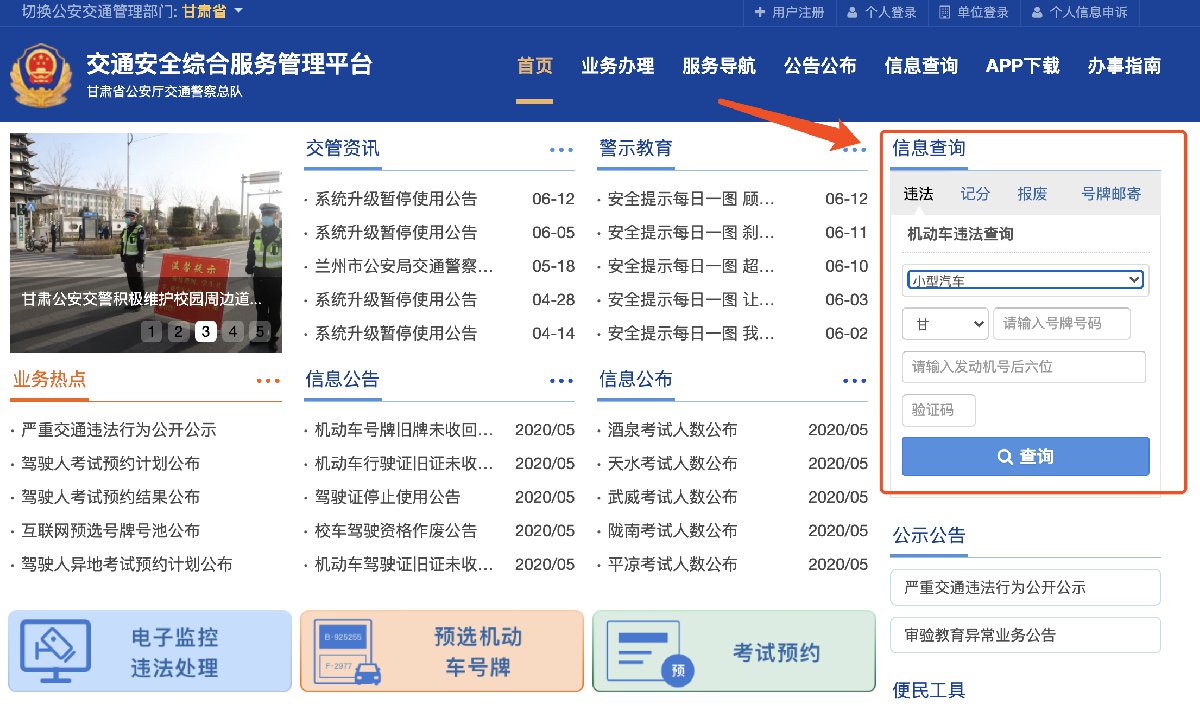 登录“甘肃省交通安全综合服务管理平台”进行查询,找到右侧的“信息查询”——“违法”板块,输入车型、车牌号码、发动机号后六位、验证码,点击查询即可。