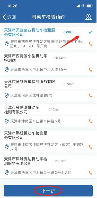 第五步、选择预约检测站,您可拨打电话、查看地图,点击下一步