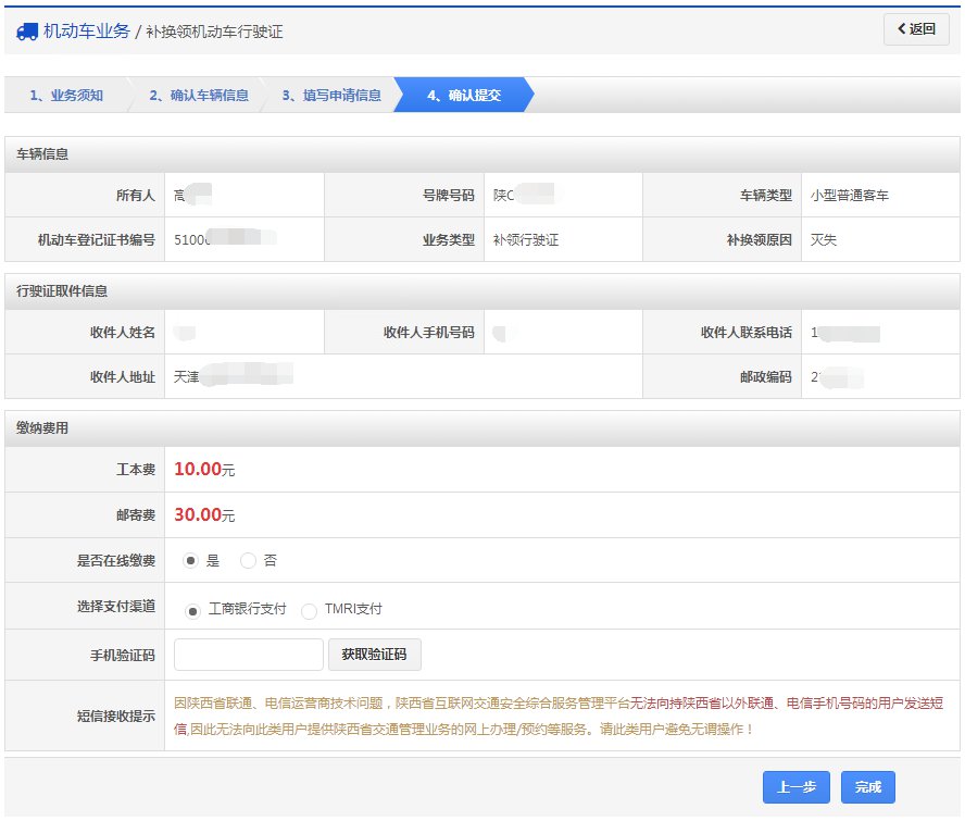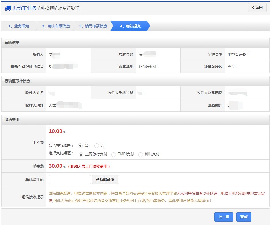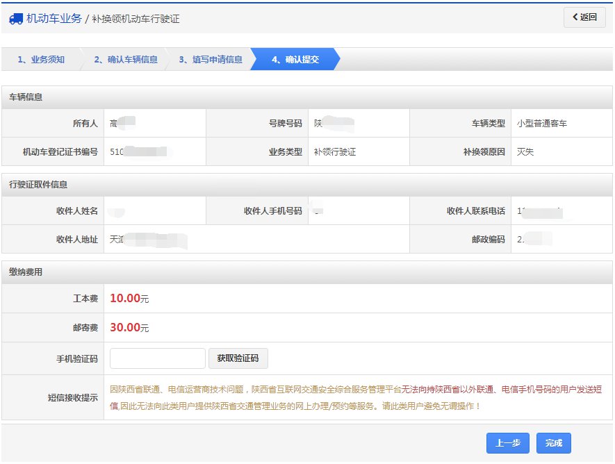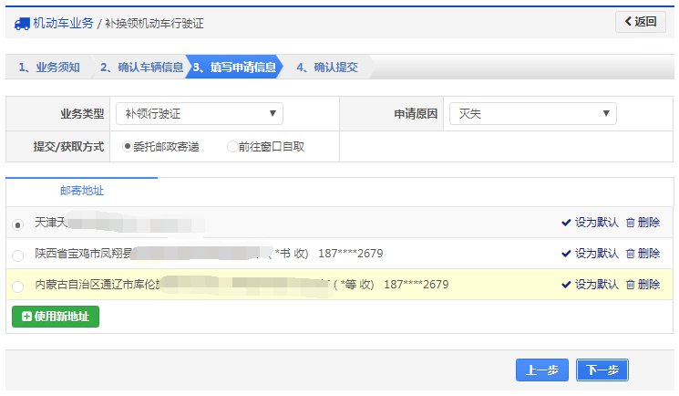 在该步骤,用户填写业务类型、申请原因、取件方式,对邮政寄递的选择邮寄地址,窗口自取的选择自取车管所等资料信息。如下图所示,确认后点击【下一步】按钮进入步骤4【确认提交】。