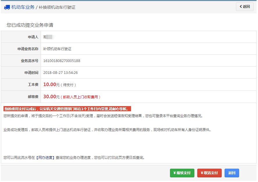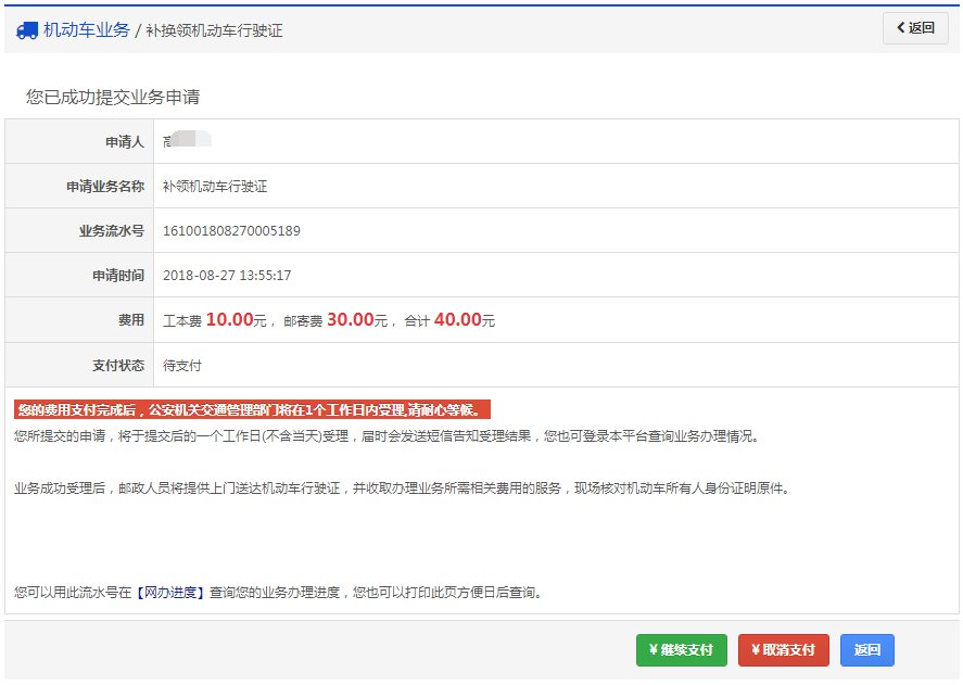 如果平台支持在线缴纳工本费与邮费且选择在线缴费,提交完成后显示如下: