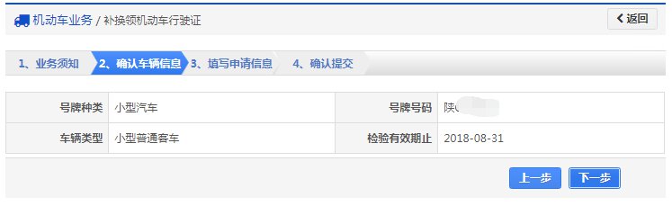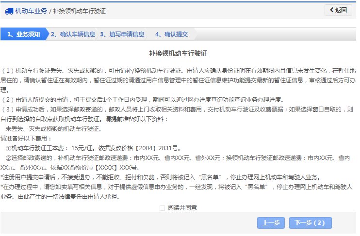 在该步骤,用户需认真阅读其内容,包括:办理补换领机动车行驶证需要注意的各项内容和相关责任,如下图所示。同意的,勾选“阅读并同意”,点击【下一步】进入步骤2【确认信息】。