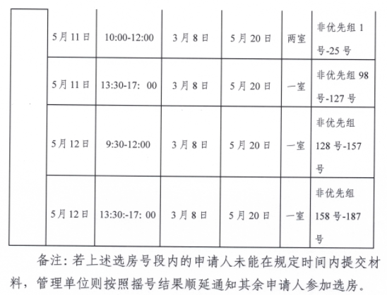 备注:若上述选房号段内的申请人未能在规定时间内提交材料,管理单位则按照摇号结果顺延通知其余申请人参加选房。