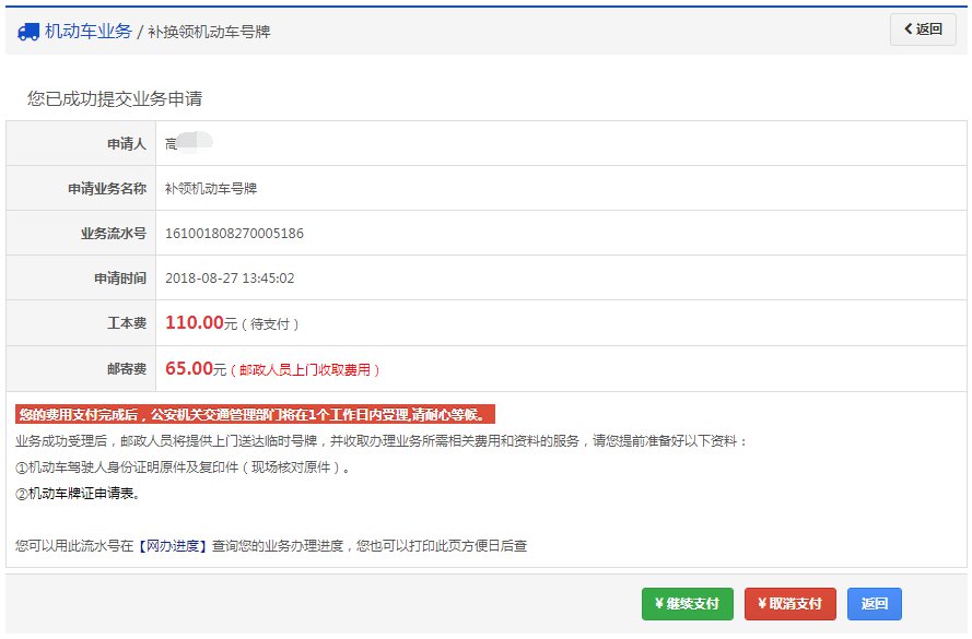 如果平台支持在线缴纳工本费与邮费且选择在线缴费,提交完成后显示如下: