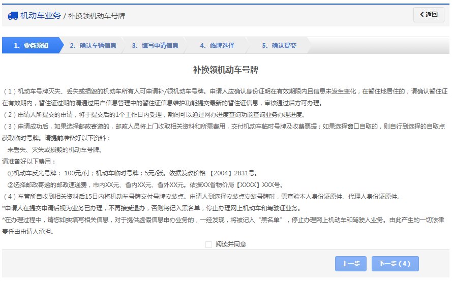 在该步骤,用户需认真阅读其内容,包括:办理补换领机动车号牌需要注意的各项内容和相关责任,如下图所示。同意的,勾选“阅读并同意”,点击【下一步】进入步骤2【确认信息】。