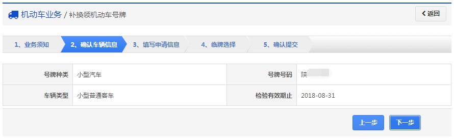 互联网注册用户在互联网登录后,点击【机动车业务】→【补换领机动车号牌】进入补换领机动车号牌业务流程。通过该功能只可以为自己名下绑定机动车补换领机动车号牌。