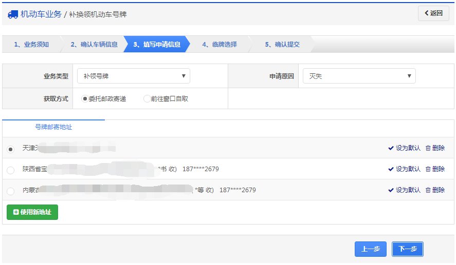 在该步骤,用户填写业务类型、申请原因、是否需要临牌、取件方式、临时号牌邮寄地址和机动车号牌上牌点等资料信息。如下图所示,确认后点击【下一步】按钮进入步骤4【确认提交】。