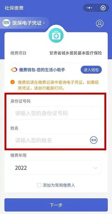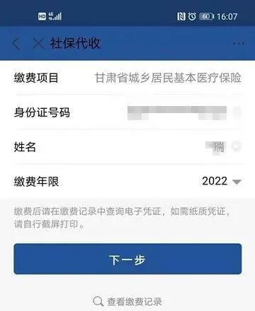 6.按要求输入参保居民身份证号、姓名并确认参保年度、参保地信息后点击【下一步】,支付完成后完成缴费,居民可截屏“电子缴费凭证”。