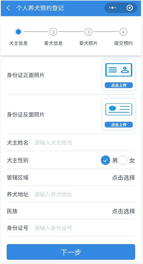 预约登记信息审核通过并为犬只做过检疫免疫后,请携带材料就近前往各分县局限养办注射电子标识(芯片),办理现金缴费手续并领取《养犬登记证》