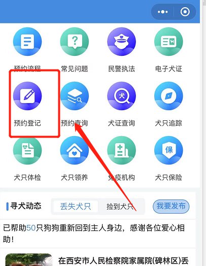 2.点击小程序中"预约登记"功能,完成养犬信息填写;