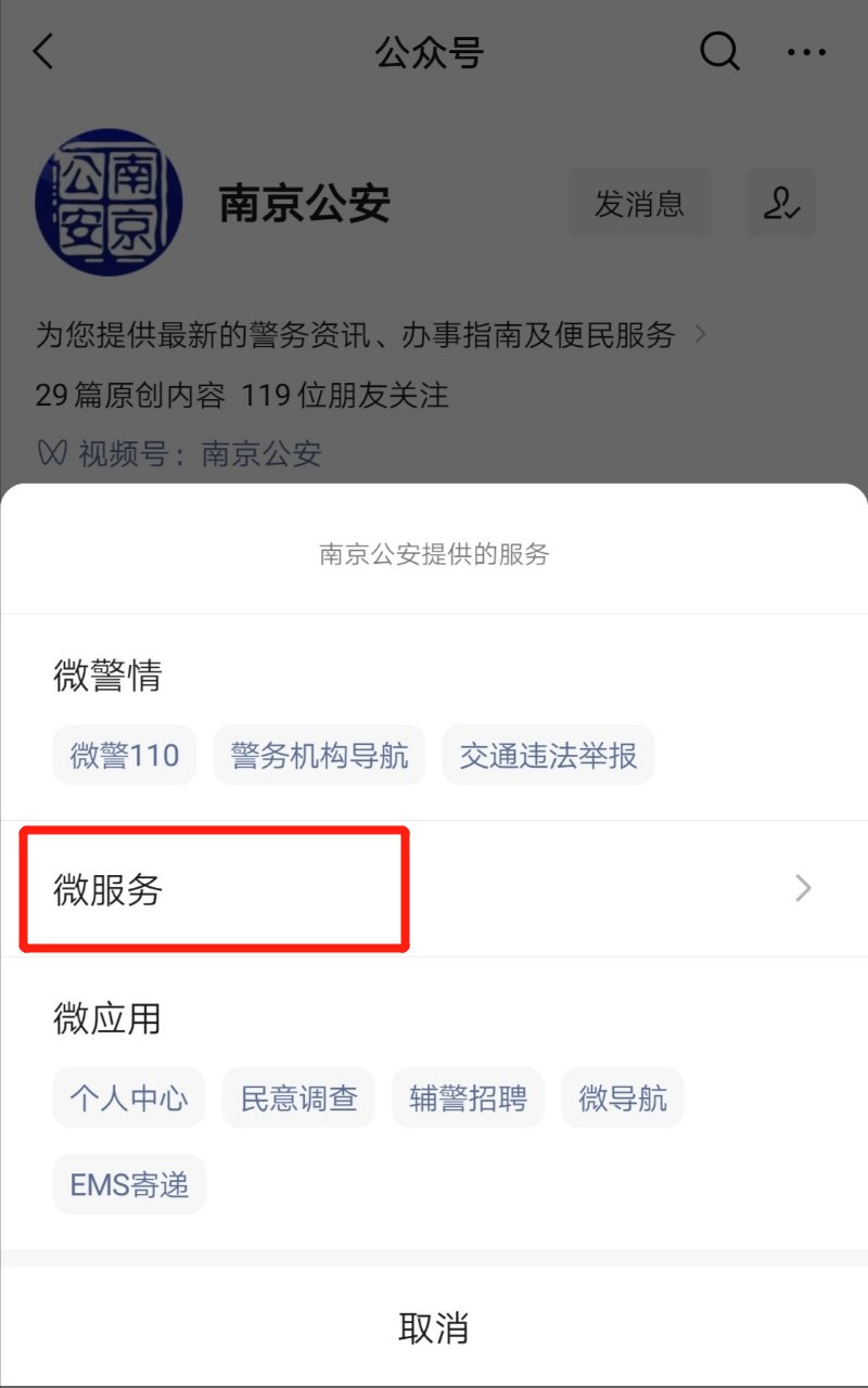 1.进入“南京公安”微信公众号,选择“微服务”